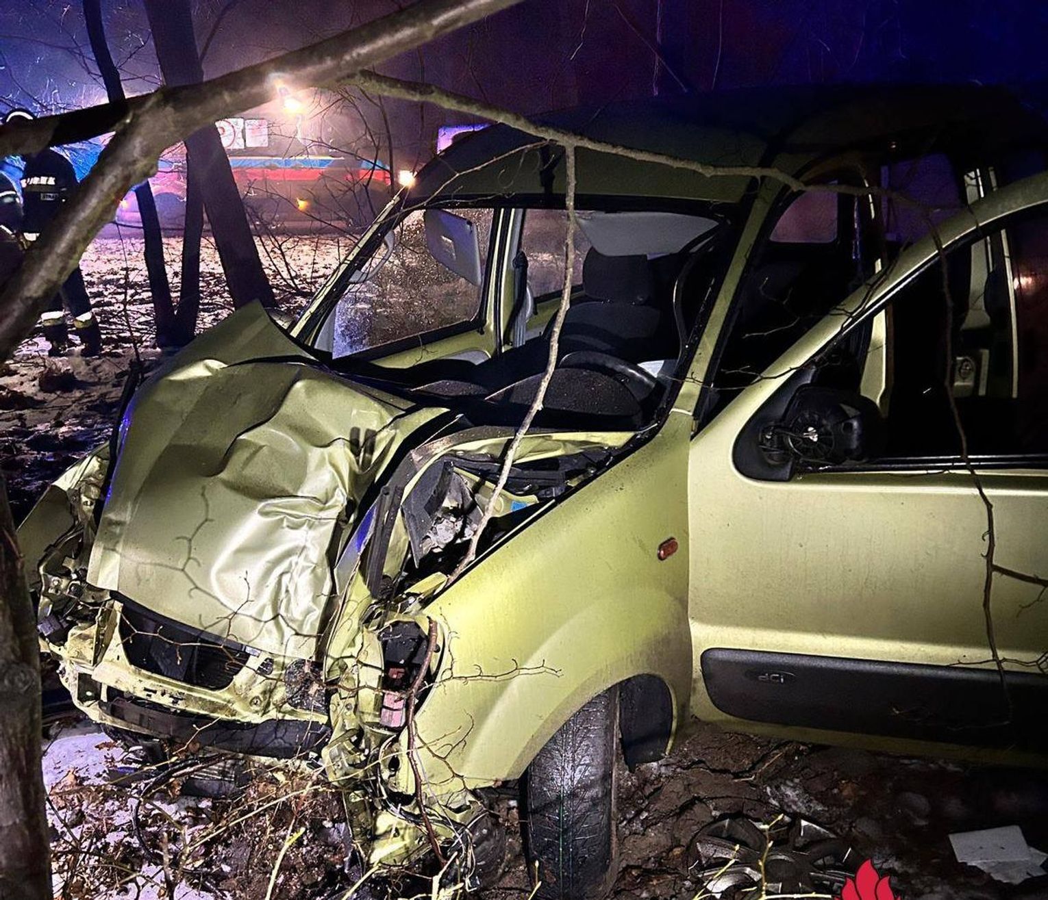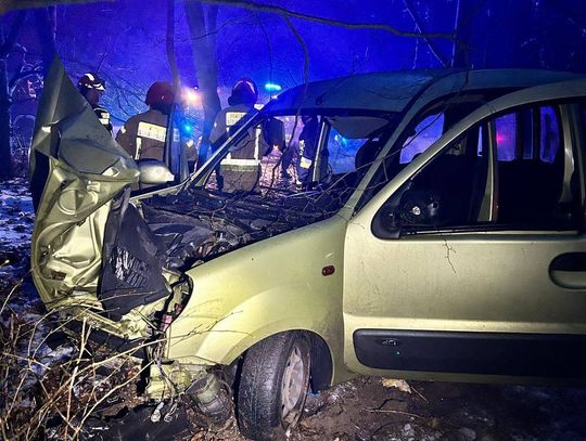 Zdjęcia z miejsca zdarzenia publikowane przez KM PSP Toruń pokazują ogromną skalę zniszczeń – przód pojazdu został całkowicie zmiażdżony, a dach i boki auta uległy poważnym odkształceniom.