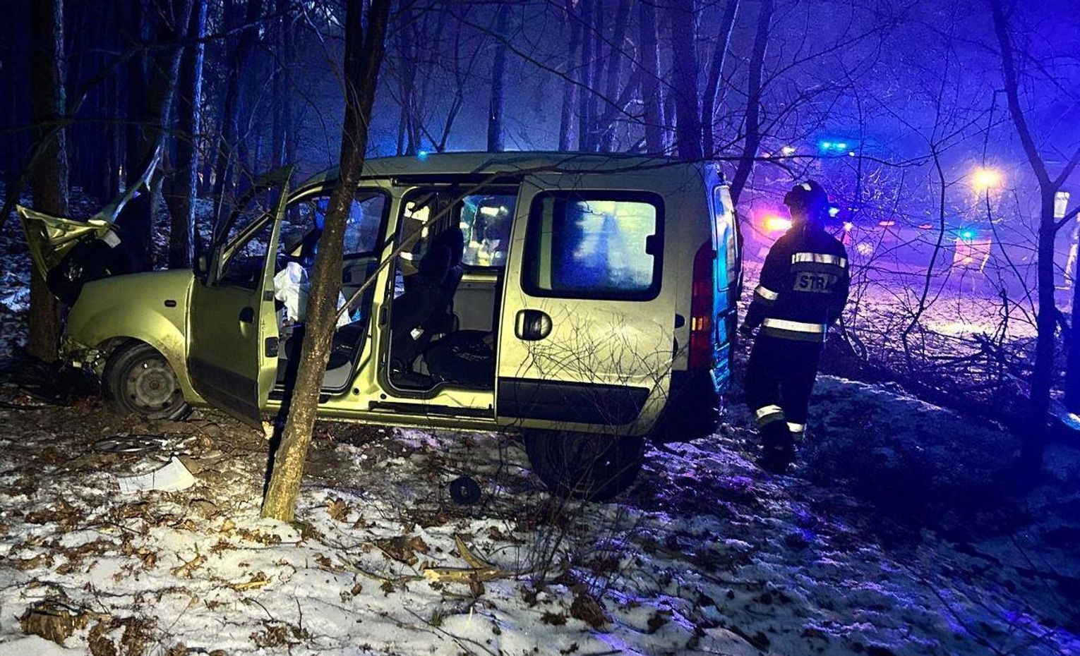 Kierujący samochodem osobowym marki Renault, jadąc w kierunku Torunia, uderzył w przebiegającego przez jezdnię dzika. Siła uderzenia była na tyle duża, że pojazd stracił przyczepność, zjechał z drogi i zatrzymał się głęboko w lesie, uderzając w drzewa.