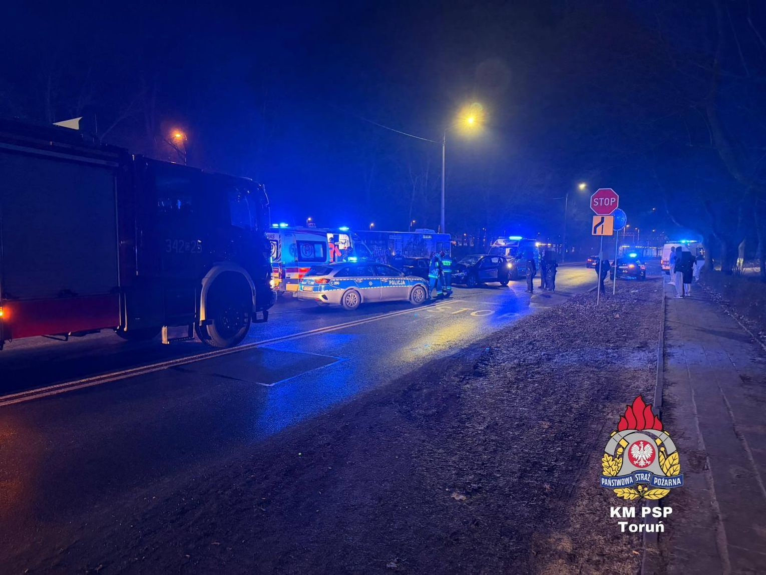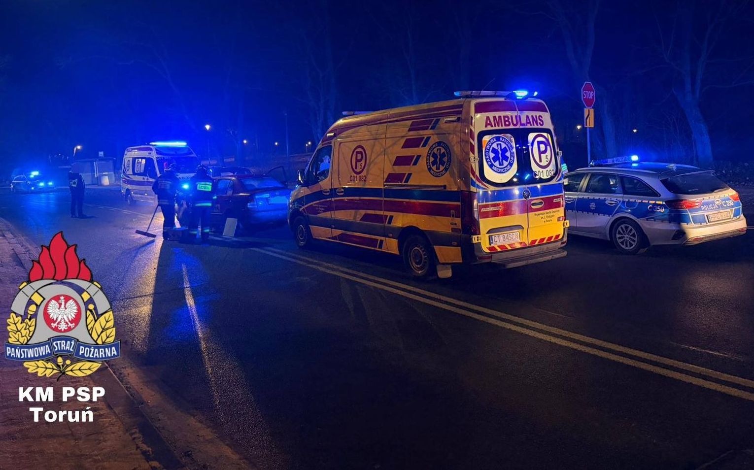 Na miejscu natychmiast pojawiły się wyspecjalizowane jednostki zastępy z JRG nr 2 w Toruniu, zastępy Wojskowej Straży Pożarnej, Zespół Ratownictwa Medycznego (widoczna na zdjęciu karetka na sygnałach).