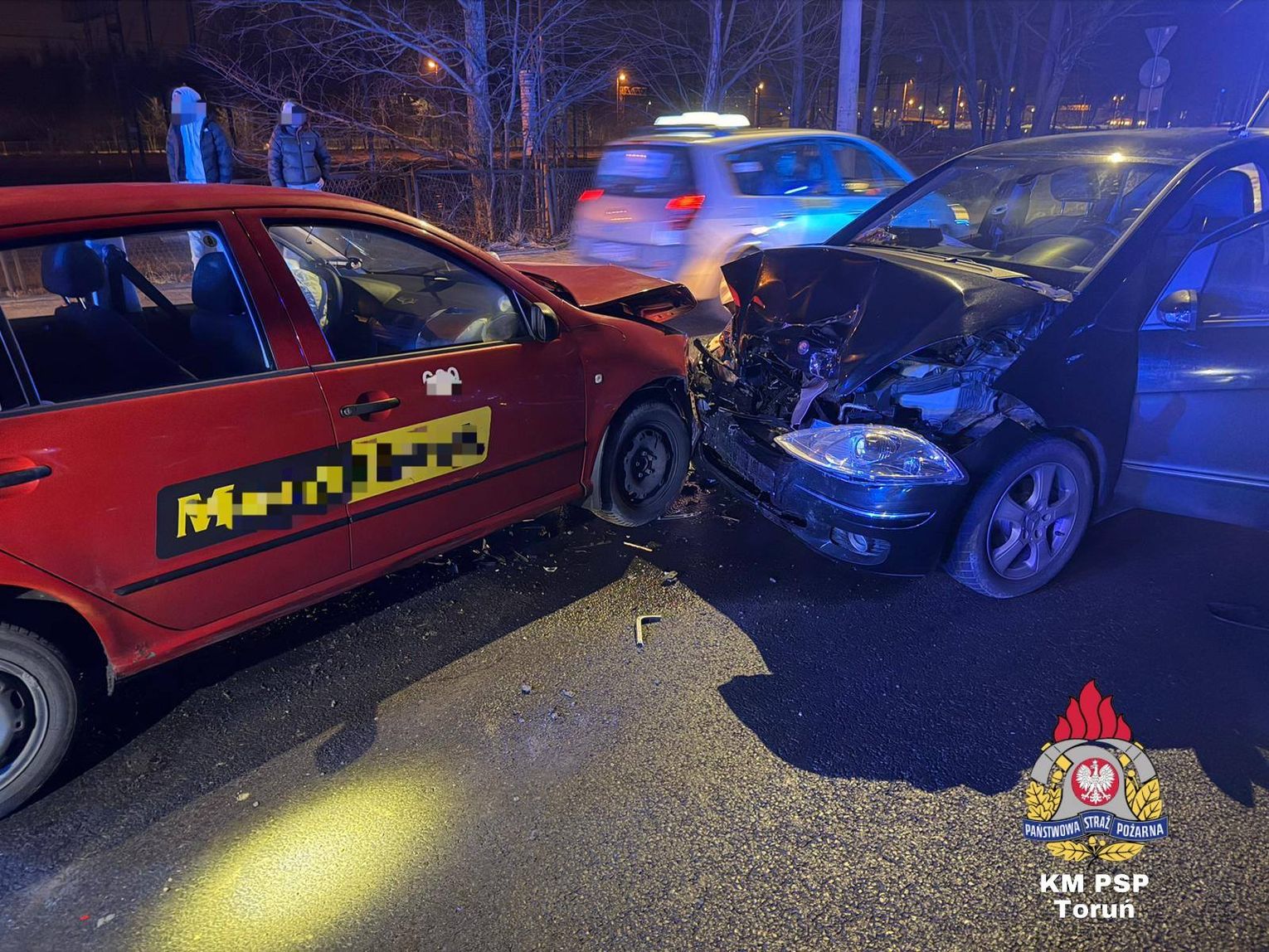Do zdarzenia doszło około godziny 21:48. Jak informuje Komenda Miejska Państwowej Straży Pożarnej w Toruniu, w kolizji uczestniczyły dwa pojazdy. Na zdjęciach z miejsca wypadku widać skalę zniszczeń – doszło do niemal czołowego zderzenia czerwonego samochodu osobowego (oznaczonego jako taksówka) oraz czarnego vana/hatchbacka.