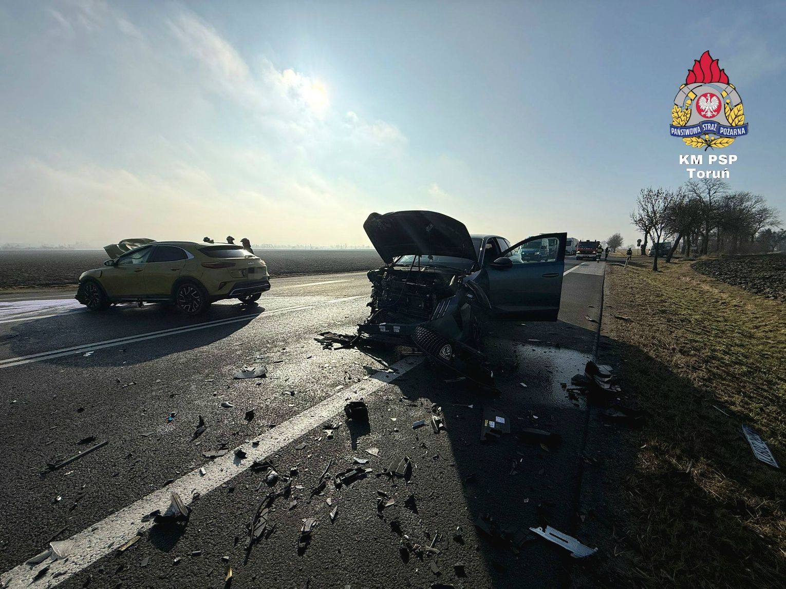 Na miejscu ratownicy zastali dwa rozbite auta osobowe – żółtą Kię oraz szarego Volkswagena. Jak wynika ze wstępnych oględzin i udostępnionej dokumentacji fotograficznej, doszło do bardzo silnego zderzenia, w wyniku którego przody obu pojazdów zostały zmiażdżone, a w autach wystrzeliły poduszki powietrzne. Elementy karoserii i płyny eksploatacyjne zostały rozrzucone na znacznym odcinku drogi.