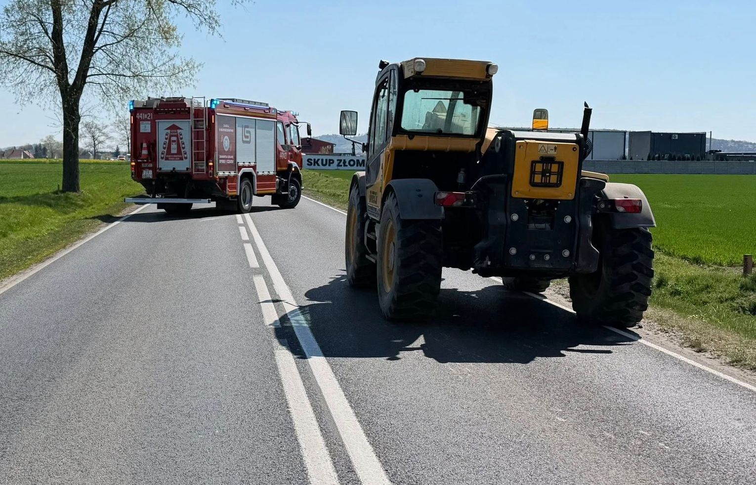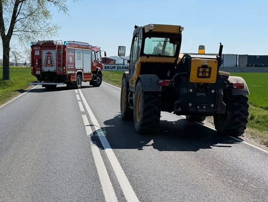 Pojazd wolnobieżny (ładowarka teleskopowa na zdjęciu), w który uderzyła osobówka, również odniósł uszkodzenia, choć ze względu na swoją konstrukcję, były one mniej widoczne na pierwszy rzut oka. Uszkodzony tył maszyny, wgnieciona blacha i wystające elementy świadczyły o tym, że uderzenie było bardzo silne. Na szczęście, operator pojazdu wolnobieżnego nie odniósł poważnych obrażeń.