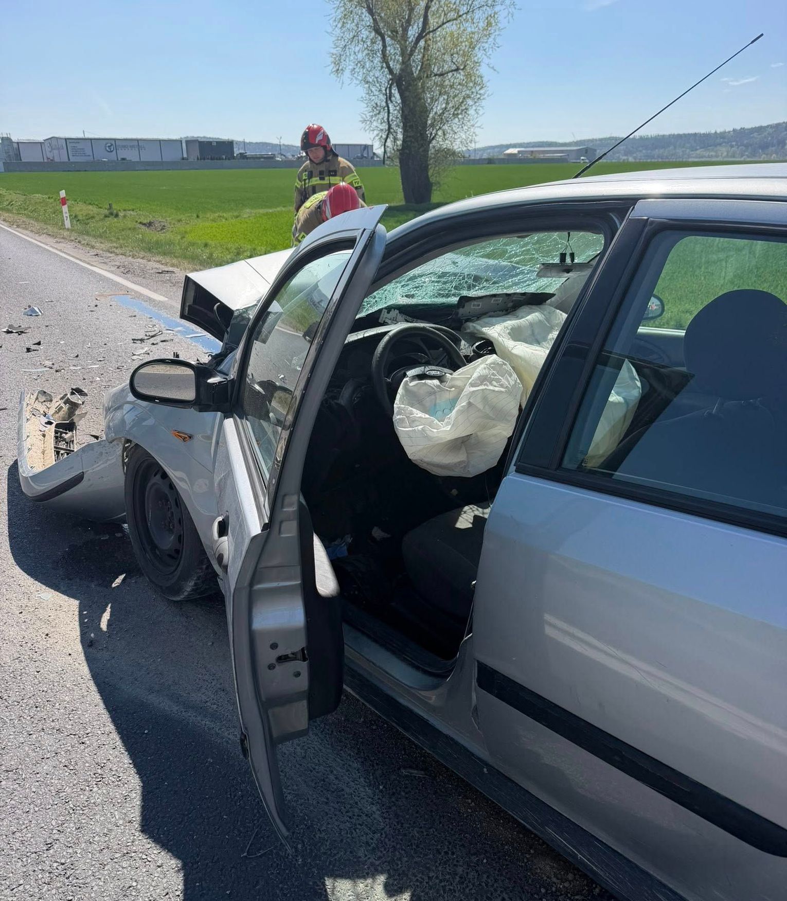 Widok miejsca wypadku był przerażający. Zdjęcia nie oddają w pełni dramatyzmu sytuacji, ale wyraźnie pokazują skalę zniszczeń. Srebrny samochód osobowy (zobacz zdjęcie ) to Ford Focus po zderzeniu wyglądał jak sterta złomu. Przód auta był doszczętnie zmiażdżony, maska wygięta w nienaturalny sposób, a silnik praktycznie zniszczony. Wnętrze pojazdu również ucierpiało – wystrzelone poduszki powietrzne (zobacz kolejne zdjęcie w fotogalerii) świadczyły o ogromnej sile uderzenia. Na asfalcie widniały plamy rozlanych płynów eksploatacyjnych, a wszędzie leżały odłamki plastiku i szkła.